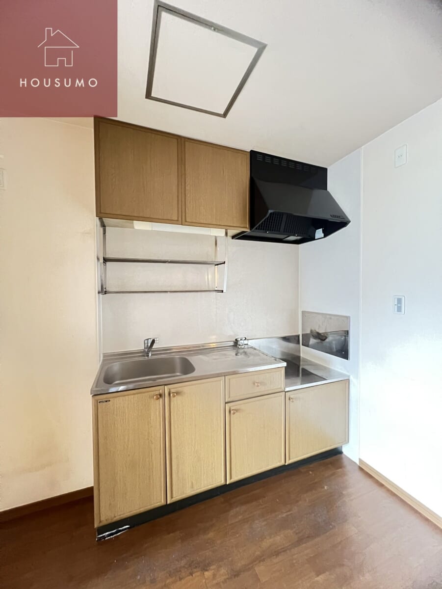 キッチンは壁付きですがダイニングと動線が短く、料理をしながら家族との会話を楽しむことができ、コミュニケーションの取りやすさが魅力です。コンロは自分で設置するタイプとなっているため、ガスコンロ・IHなどライフスタイルや好みに合わせて自由に選べます。上部に吊り戸棚もあるため、日常使いの食器を置くのにピッタリです。
