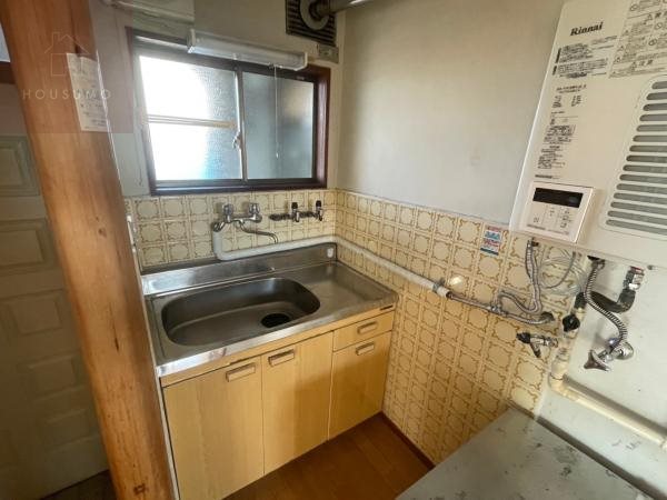 キッチンの正面には小窓があり、自然光が差し込む明るい空間。料理中でも外の風を感じられ、換気もしやすい設計です。コンロは小さめのものが設置できる仕様で、一人暮らしや年配の方にも使いやすいサイズ感。全体的にレトロな雰囲気が漂い、昭和の懐かしさを感じる味わい深いキッチンです。