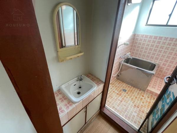 バスルームと統一感のあるピンクのタイルが印象的な脱衣室。どこか懐かしく温かみのある色合いが、毎日の身支度の時間をやさしく包み込みます。小さめの独立洗面台が設けられており、限られたスペースを上手に活用した機能的なレイアウト。洗顔や歯磨きなどのちょっとした動作もスムーズに行える、使い勝手の良い空間です。レトロな雰囲気を残しつつ、実用性もしっかり備えています。