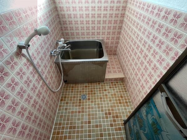 小窓が付いており、やわらかな自然光が差し込む明るいバスルーム。換気もしやすく、湿気がこもりにくい快適な空間です。銀色のステンレスバスタブが印象的で、昭和の雰囲気を感じさせるどこか懐かしいレトロデザイン。シンプルながらも実用性が高く、昔ながらの温もりある空間でゆったりとしたバスタイムを楽しめます。