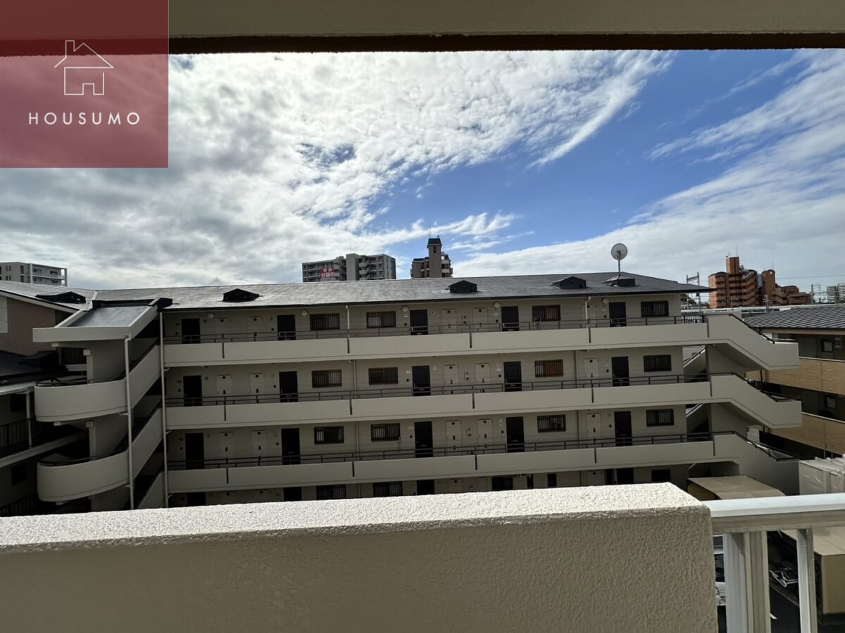 バルコニー前にはマンションがありますが、視界の上部には青空がしっかりと抜けており、圧迫感のない明るい眺望です。南向きならではの光が差し込み、室内も日中は自然光で心地よい雰囲気に。建物の影になりにくく、洗濯物もしっかり乾くため、日当たりの良さを感じられる住まいです。