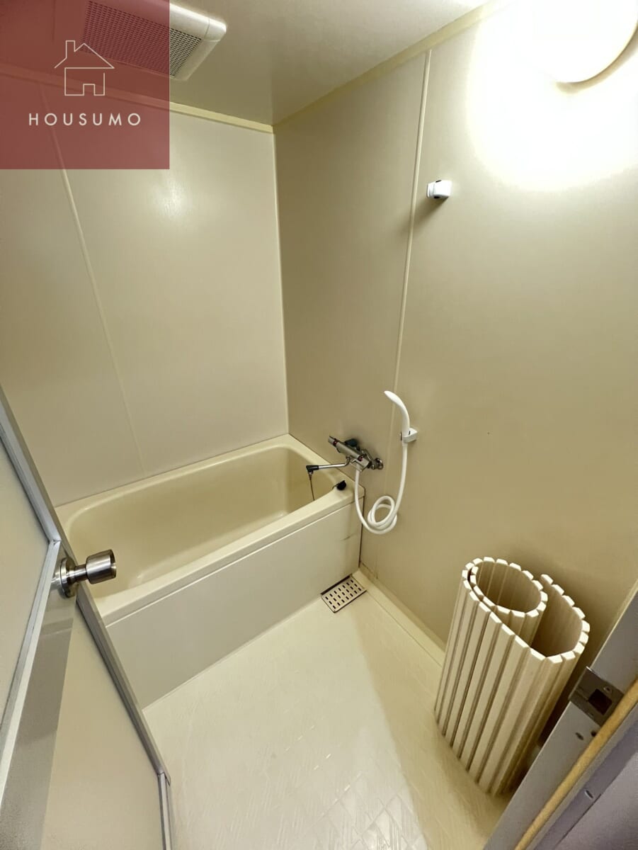 バスルームはシンプルでコンパクトな無駄をそぎ落としたミニマルな空間で、余計な装飾や収納棚がないため、水アカがたまりにくく掃除がしやすいのが特徴です。浴槽には、自動温度調整できる給湯機能付きでぬるめが好きな方も、しっかり温まりたい方も、自分好みの温度設定が可能です。セパレードタイプなので、日常的に湯船につかる方にはぴったりです◎
