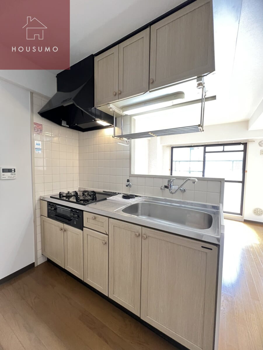 料理好きにはたまらない、三口ガスコンログリル付きの本格派キッチンを完備。火力調整もしやすく、同時調理もスムーズ。シンクも調理台も広く、収納もたっぷり確保されているため、調理道具や食器をすっきり収納できます。自炊派の方に理想的なキッチンスペースです。