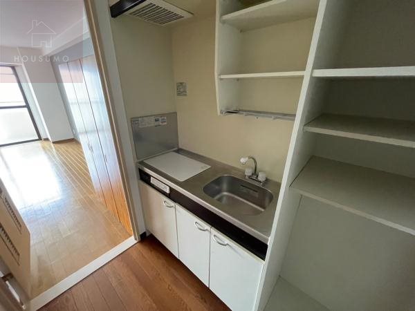 IH2口コンロを備えたキッチンは、シンプルながらも実用性を重視した設計です。調理スペースはコンパクトですが、コンパクトな分、お手入れが簡単で日々の掃除もラクラク。キッチン横には収納棚が設置されており、調味料や調理器具、食器類もすっきり整理可能です。一人暮らしや学生の自炊には十分な機能を備えており、効率よく料理ができるのが魅力。南向きの洋室からの自然光も届き、明るい雰囲気の中で調理が楽しめます。
