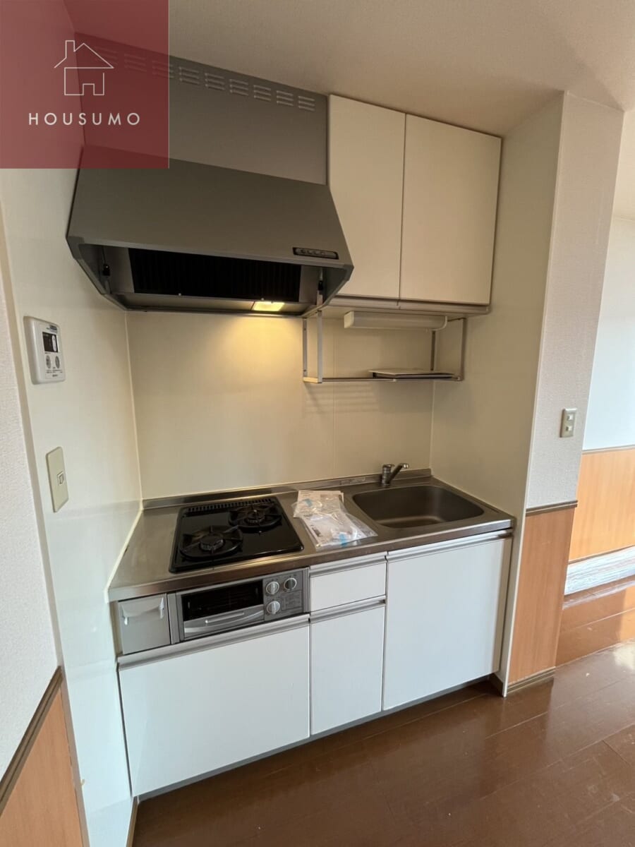 2口ガスコンロに加え、グリルも備えた使い勝手の良いキッチンは、同時に調理ができるため、忙しい朝の時間や自炊を楽しみたい方にもぴったりです。下部には引き出し式の収納スペースがあり、鍋やフライパンなどの調理器具をすっきり整理可能。コンパクトながらも機能性の高い設計で、料理がしやすい快適な空間になっています。