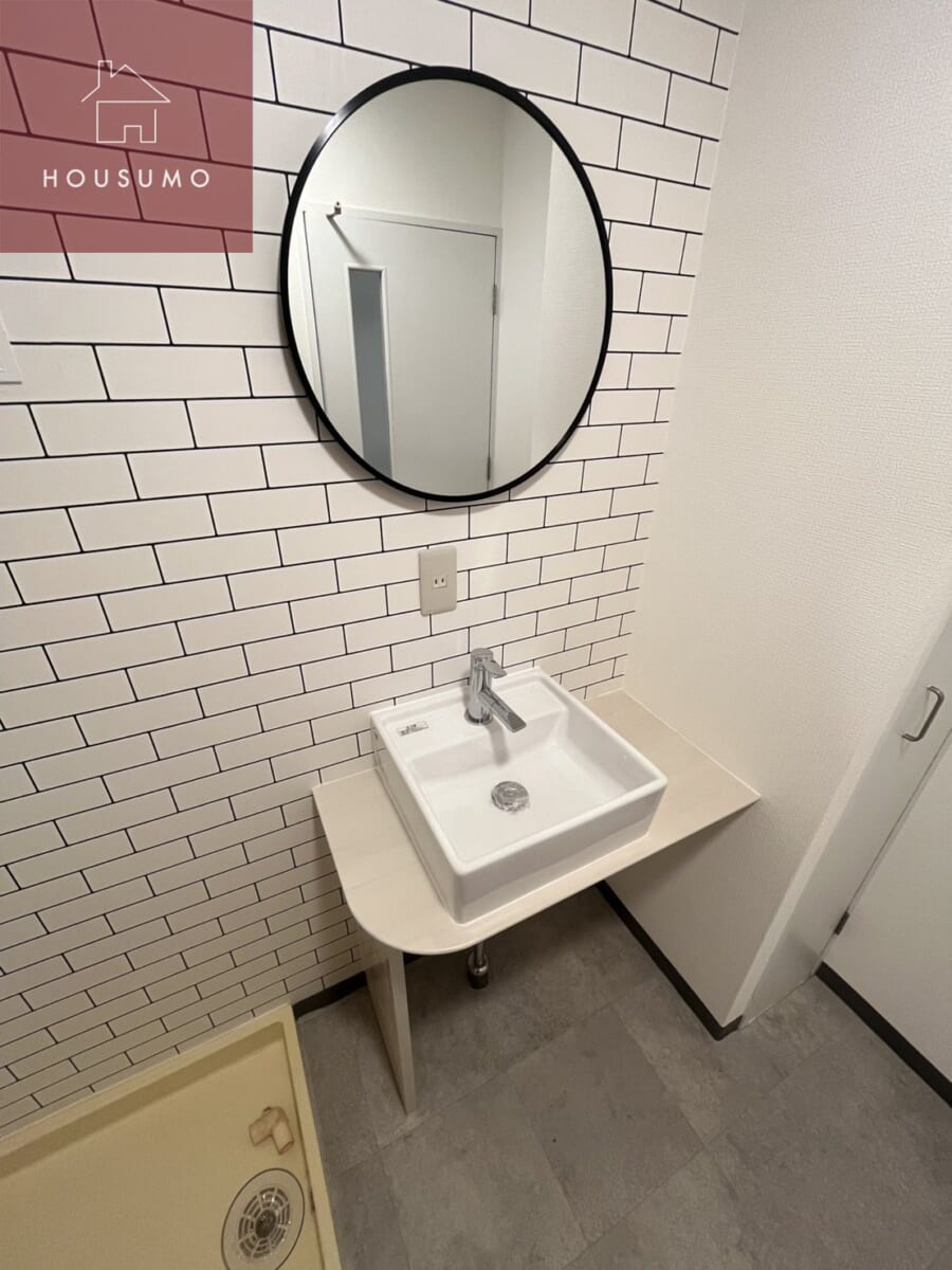 リノベーションで一新された脱衣室は、おしゃれな雰囲気が漂うデザイン空間。壁は上品なタイル調で仕上げられ、ホテルライクな印象を演出しています。独立洗面台には丸い鏡が設けられ、やわらかな照明と相まって朝の身支度も気分が上がるスペースに。さらに、使い勝手の良い収納棚も備え付けられており、タオルや洗面用品をすっきり整理可能。機能性とデザイン性を兼ね備えた、魅力的な脱衣スペースです◎