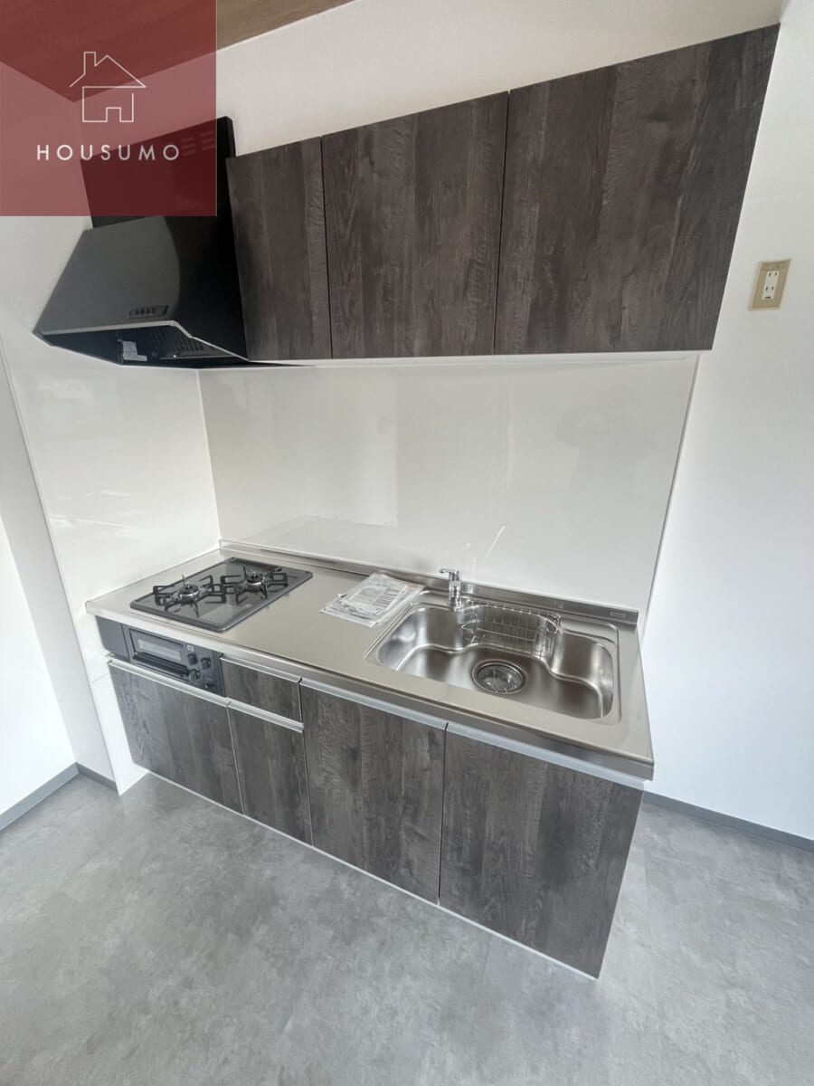 2口ガスコンロにグリル付きのシステムキッチンを新設。シンクも広く、料理や片付けがスムーズに行えます。作業スペースがしっかり確保されているので、自炊派の方にも嬉しい仕様です。清潔感のあるホワイト系カラーでまとめられ、グレーのフローリングとのコントラストも美しい仕上がりです。
