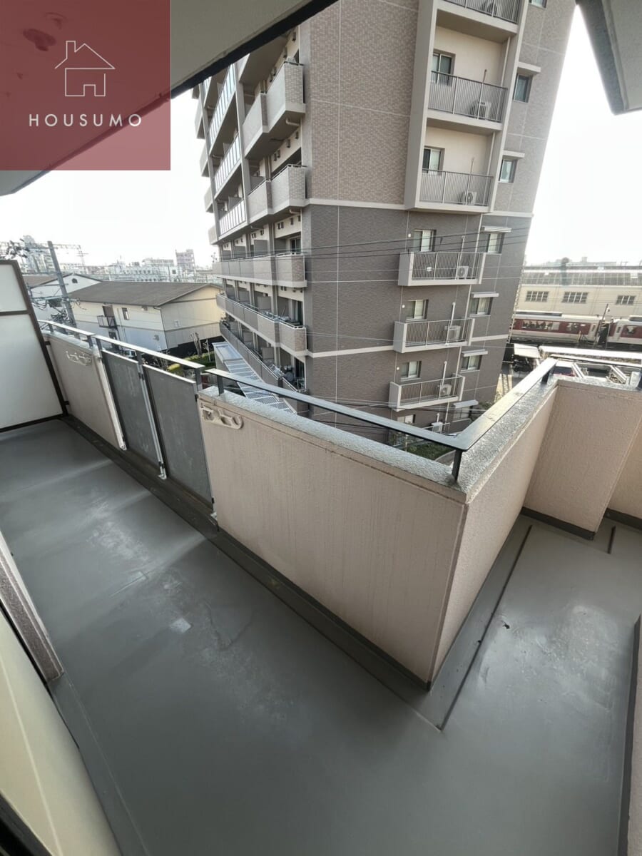 バルコニーはL字型に広がり、リビングと洋室の両方から出入りできる便利な造り。開放感のある形状で、洗濯物をたっぷり干せるスペースが確保されています。西向きのため夕方にはやわらかな光が差し込み、心地よい時間を過ごせます。展望は目の前にマンションがありますが、その分プライバシーを意識した落ち着いた住環境。風通しも良く、日常生活に程よい快適さをもたらしてくれます。