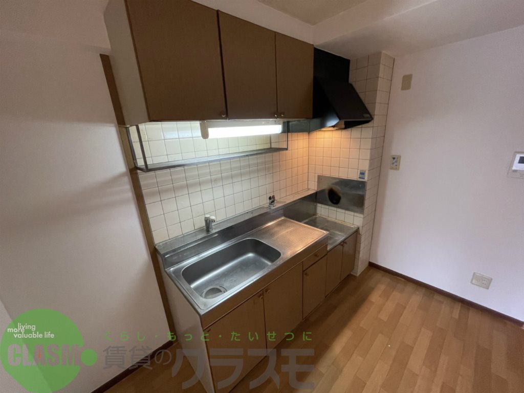 キッチンはコンパクトながらも使い勝手を考えた設計で、毎日の料理がスムーズに。シンク横には作業スペースが確保されており、食材や調理器具を置くことが可能です。コンロは自分で設置するタイプなので、ライフスタイルに合わせてガスやIH、グリル付きと自由に選ぶことができます。上部に吊り戸棚もあるため、日常使いの食器を置くのにピッタリです。