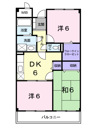 南向きで日当たりの良い3DKタイプで、DKは約6.5畳あり、小さめのテーブルやカウンターを置いてもゆとりのある空間です。キッチンと隣接した間取りなので、料理をしながら家族と会話を楽しむこともできます。洋室は6畳が2部屋、どちらも独立しており、子ども部屋や寝室、書斎としても使いやすい配置です。さらに和室6畳もあり、客間やくつろぎスペースとして活躍します。和洋のバランスが取れた、落ち着きのあるファミリー向けのお部屋です◎