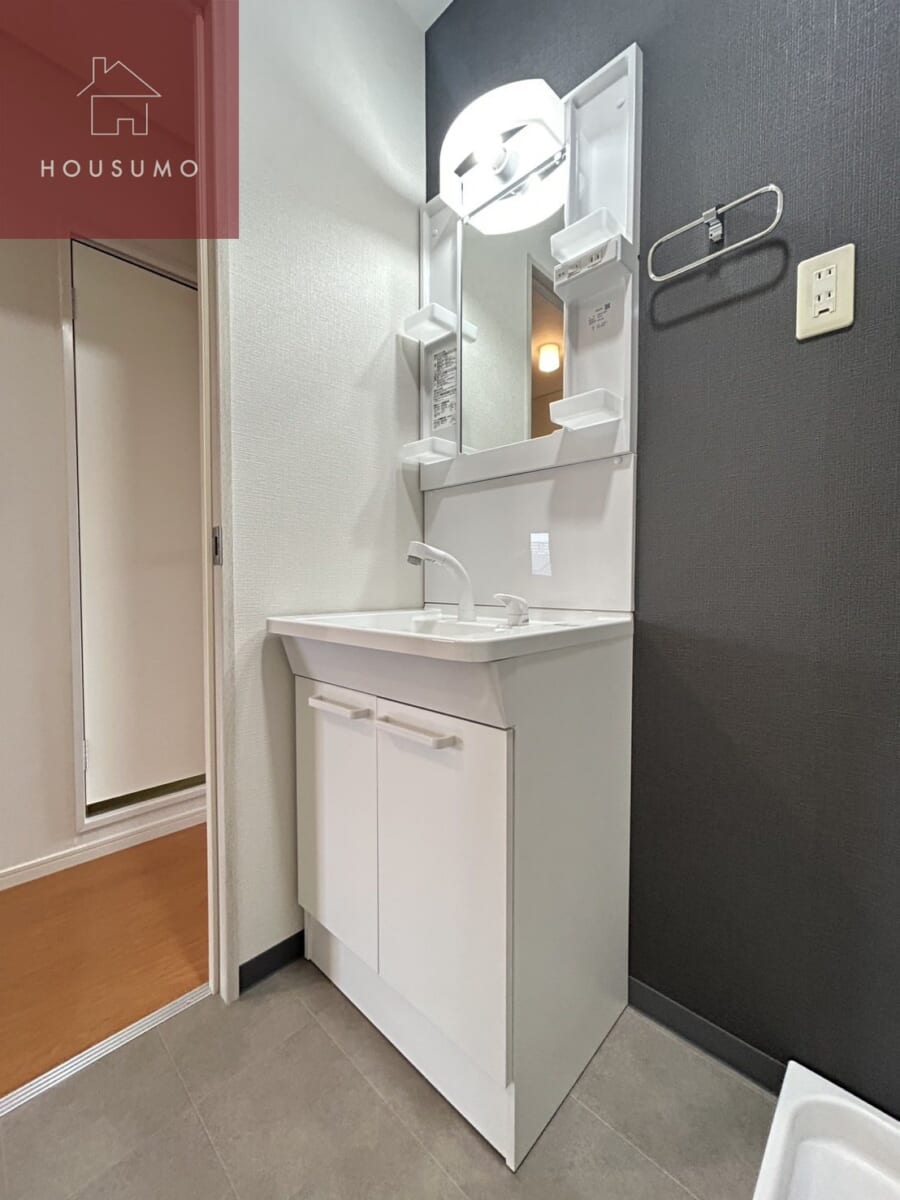 脱衣室には独立洗面台と洗濯機置き場を完備しており、朝の身支度や入浴後の動線がスムーズで、家族が同時に使っても快適に過ごせます。小さなお子様がいるご家庭でも、洗面から洗濯、入浴の流れが一か所で完結するため安心で、水まわりを効率的にまとめた設計は、毎日の家事の時短にもつながります。