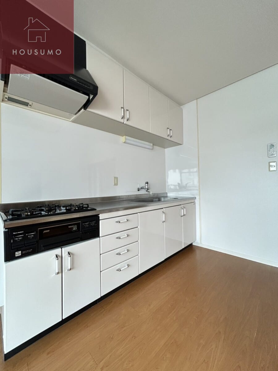 キッチンは対面式ではありませんが、冷蔵庫や家電スペースもゆとりのある設計で、3口ガスコンロにグリル付きなので、同時調理ができ時短にもなり日常に余裕ができます。揚げ物もグリル料理もこなせるので、自炊派の方にとってはまさに理想のキッチンです◎引き出し収納もあるので、調理道具やカトラリー、ラップ・調味料などの小物もすっきり収まります。ダイニングとの動線も短く、小さなお子さんがいても目の届く範囲なので安心です。