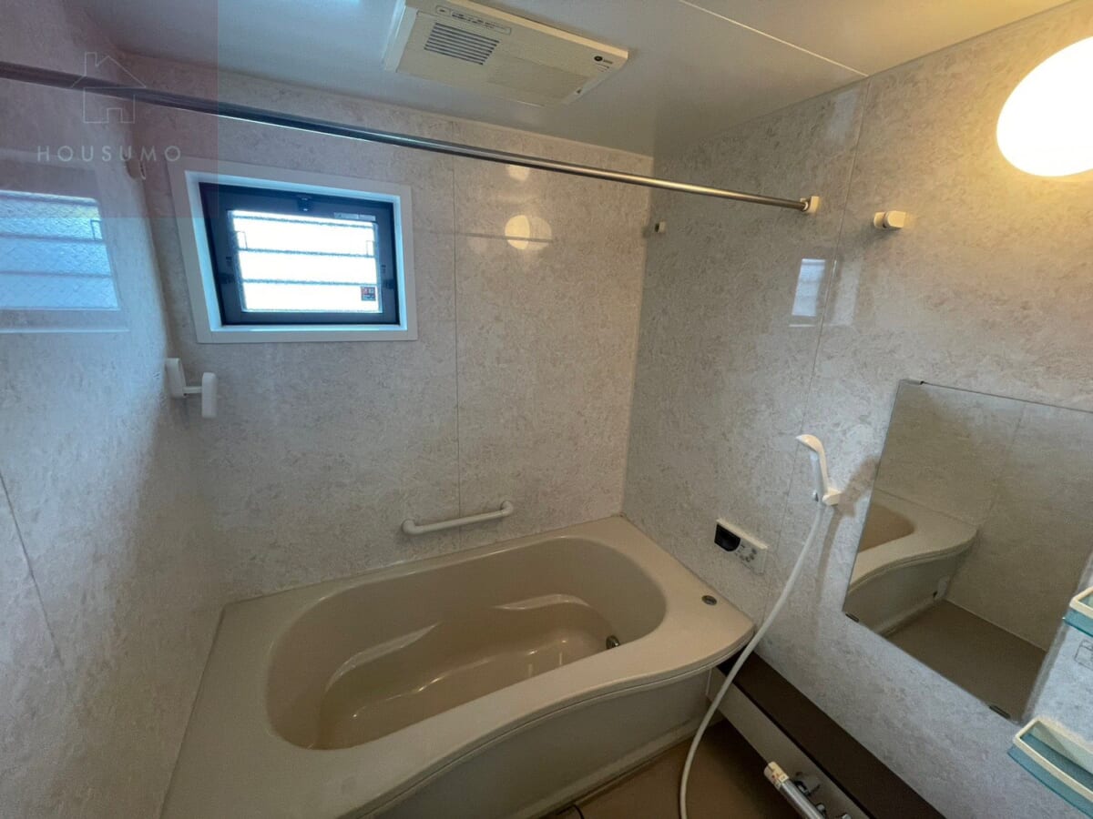 バスルームは、毎日の疲れをしっかり癒せる“ゆったりサイズ”が魅力で、足を伸ばして浸かれる広さがあり、リラックスタイムを贅沢に過ごせる空間です。さらに小窓付きのため、昼間は自然光が入り込み、明るく爽やかな雰囲気で、湿気がこもりにくく、換気もしやすい点は衛生面でも大きなメリットです。また浴室乾燥機を備えており、雨の日や夜間でも洗濯物をしっかり乾かせる実用性の高さがポイント。カビ予防にも効果的で、忙しい日々をサポートしてくれる頼もしい設備が整った快適なバスルームです◎