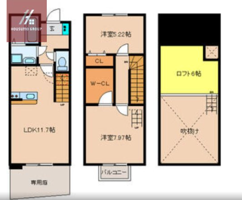 各階に収納がバランスよく配置されているため、生活動線を妨げずに自然と片付く住まいを実現。特に5.22帖の洋室にあるWCLは大きな魅力で、大型家電の箱や季節家電、衣類から趣味の道具まで一括管理できる頼もしい空間です。収納力が高いため、テラスハウスの広さをそのまま“居住スペースとして最大限活かせる”のが大きな強みです◎