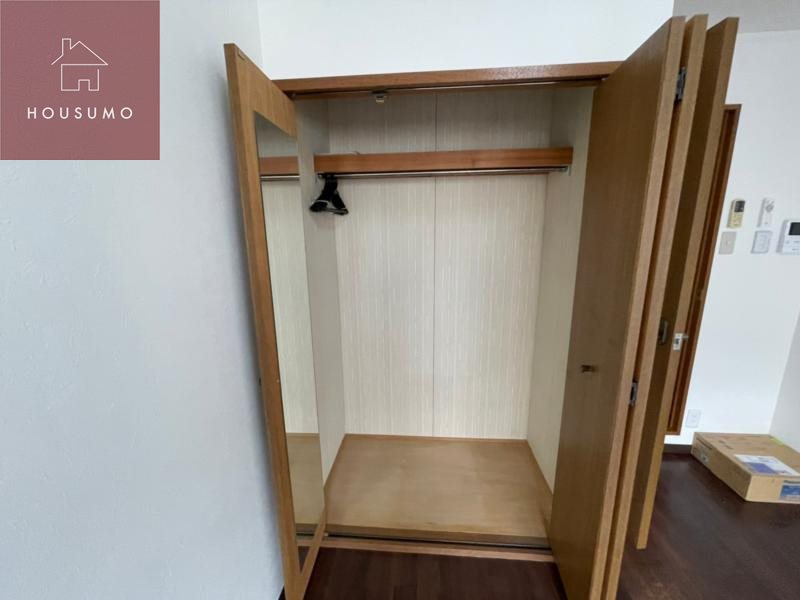 洋室には実用性の高い収納スペースが備わっており、扉の内側には全身鏡が設置されています。衣類や日用品をしまうだけでなく、身支度まで一カ所で完結できるため、朝の準備がスムーズに進む便利な仕様です。扉を閉めれば鏡が隠れるため、室内の雰囲気を損なうこともなく、生活感を抑えた空間づくりが可能。コンパクトな1Kでも暮らしの快適さを底上げしてくれる、うれしいポイントとなっています◎