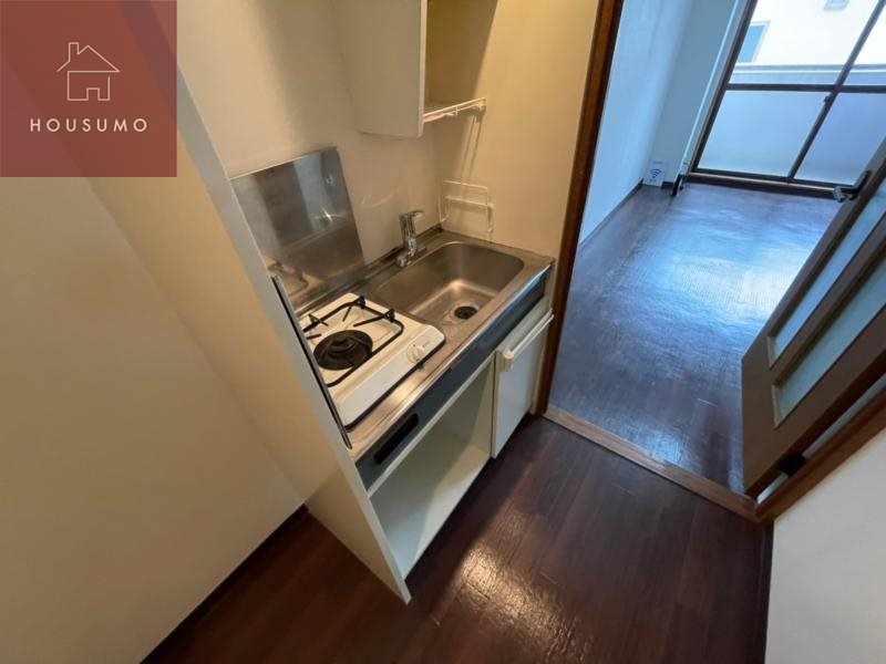 キッチンは1口ガスコンロを備えた省スペースタイプで、調理スペースはありませんが、作業台代わりになるラックやシンク上トレーなどで工夫すれば、簡単な自炊にも対応可能。出張が多く外食中心の方や、初めての一人暮らしで軽めの自炊しかしない方にはちょうどいい仕様です。収納は最小限ですが、キッチン横にはラッグを置けるスペースがあるので、物が多い人にも安心です◎
