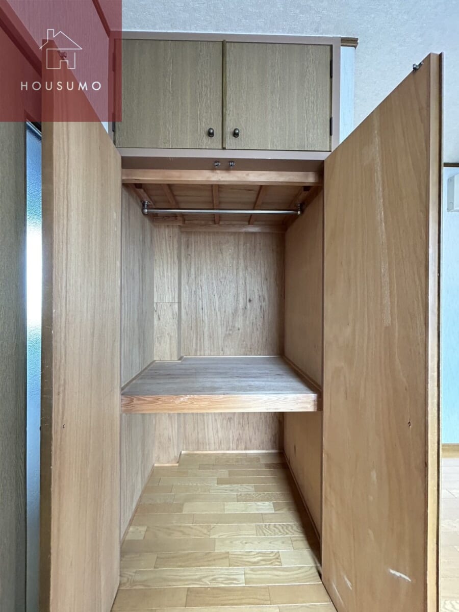 洋室に設置された押し入れ収納は、ひとり暮らしの衣類・荷物を十分にしまえる容量を確保。ハンガーパイプも付いているため、シャツやアウターをすっきり吊るして収納できます。上段には季節家電やオフシーズンの洋服を置けるスペースがあり、収納ボックスを組み合わせることで空間をさらに有効活用できます。荷物が増えがちな社会人の方や、整理整頓が得意な方にも満足度の高い収納となっています◎