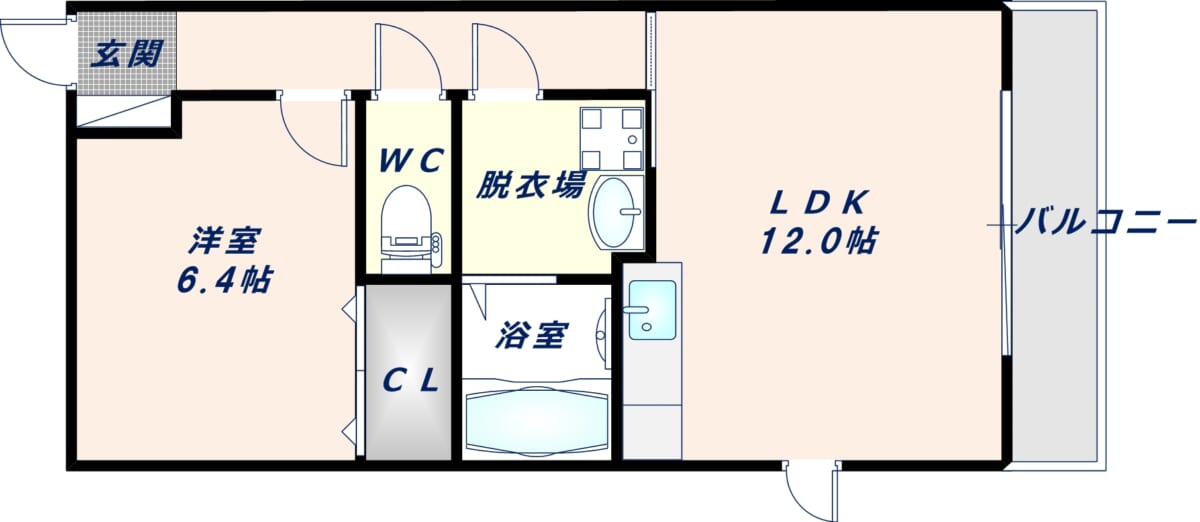12帖のLDKは、1LDKとしてはゆとりを感じられる広さで、リビングとダイニングを分けてレイアウトしやすく、ソファスペースと食事スペースをしっかり確保できます。家具配置の自由度が高いため、「ただ広いだけ」で終わらず、生活動線を意識した空間づくりが可能です。洋室はLDKとしっかり分離された独立タイプで、6.4帖の広さがあり、ベッドを置いても圧迫感が出にくく、寝室として理想的なサイズ感です。生活音や照明の影響を受けにくいため、仕事の時間帯が異なるカップルにもおすすめ。「寝る場所」と「くつろぐ場所」を分けたい方にとって、非常にバランスの良い間取りです◎