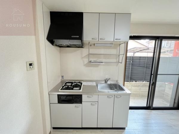 キッチンはガス2口コンロ付きのシステムキッチンで、自炊しやすい実用的な仕様です。上下に収納スペースが多く設けられており、調理器具や食器、食品ストックをたっぷり整理できます。収納力が高いため、作業スペースをすっきり保ちやすく、料理がしやすい環境。生活感が出やすいキッチン周りも、整った印象を維持しやすい点が魅力です。ワンルーム賃貸でも、収納と使い勝手を重視したい方に適したキッチンスペースです。