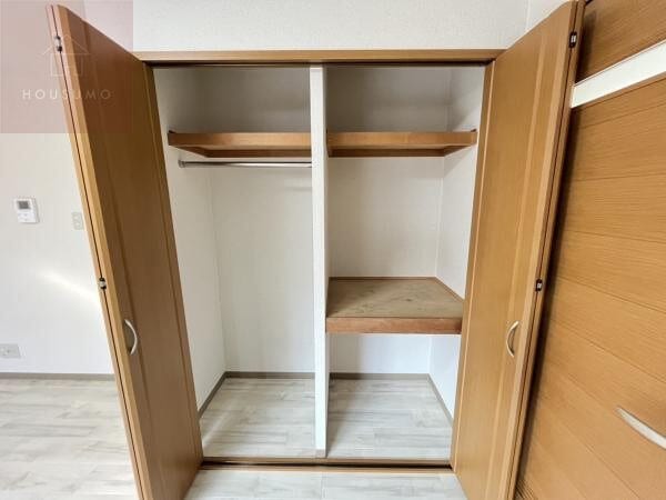 収納はクローゼットタイプで、ハンガーパイプ付きのため衣類を掛けて整理しやすい設計です。左右で使い分けができる構造になっており、衣類と小物を分けて収納可能。上部には棚スペースがあり、バッグや季節物、収納ボックスの保管にも便利です。奥行きと幅がしっかり確保されているため、見た目以上に収納力があります。荷物が多い方でも、居室をすっきり保ちやすい実用的な収納スペースです。