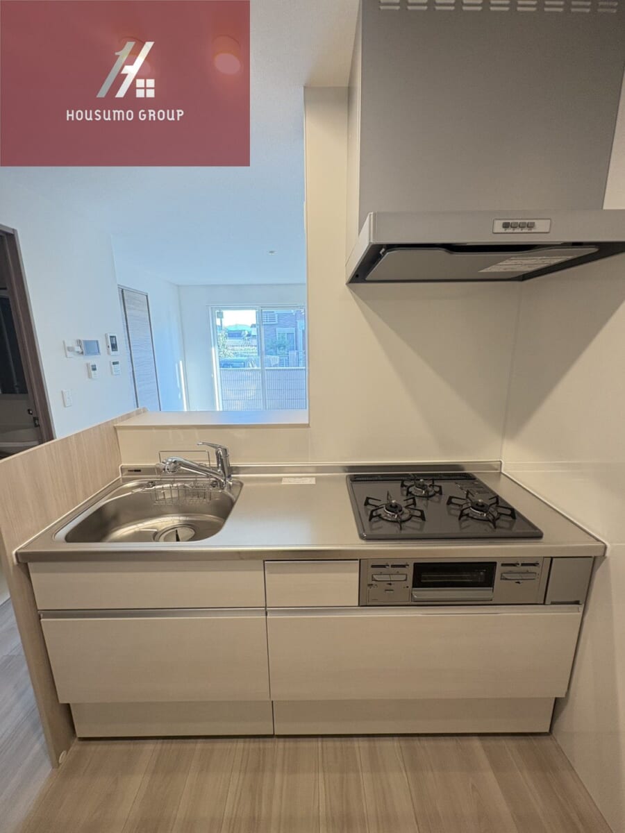清潔感のあるシステムキッチンで、明るいカラーが空間をすっきりと見せてくれます。三口ガスコンロ付きで同時調理ができ、毎日の料理も効率よく進められます。シンクと作業スペースのバランスが良く、下ごしらえや盛り付けもしやすい設計です。上下収納が充実しており、調理器具や食器をまとめて整理できます。リビングを見渡せる配置で、家族や来客との会話を楽しみながら使えるキッチンです。