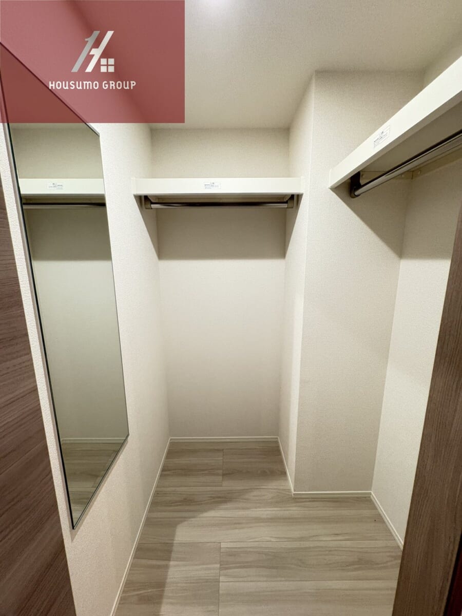 全身鏡付きで、コーディネートの確認や身支度に便利なクローゼットです。ハンガーパイプと上部棚が備え付けられており、衣類から小物まで効率よく収納可能。床は明るい木目調で、清潔感があり室内の雰囲気とも統一されています。奥行きもあり、スーツケースなどの大きめの荷物も収納しやすい実用的なスペースです。