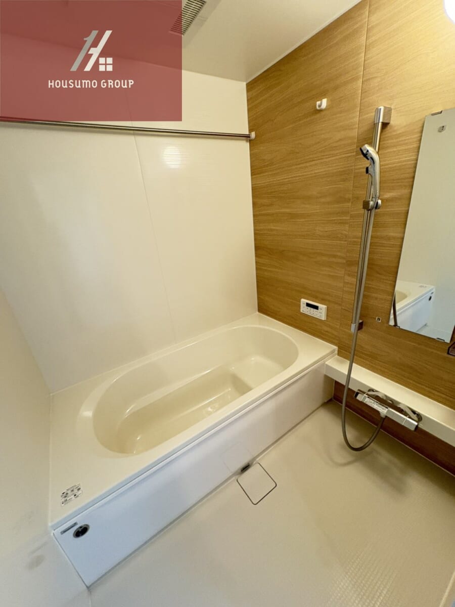 木目調パネルがアクセントになった、あたたかみのあるバスルームです。ゆったりとした浴槽で、1日の疲れをしっかりと癒せる快適な入浴時間を楽しめます。操作しやすい給湯リモコン付きで、温度調整もスムーズに行えます。シャワーは高さ調節が可能で、使う人に合わせて快適に利用できます。明るく清潔感のある空間で、お手入れもしやすいバスルームです。