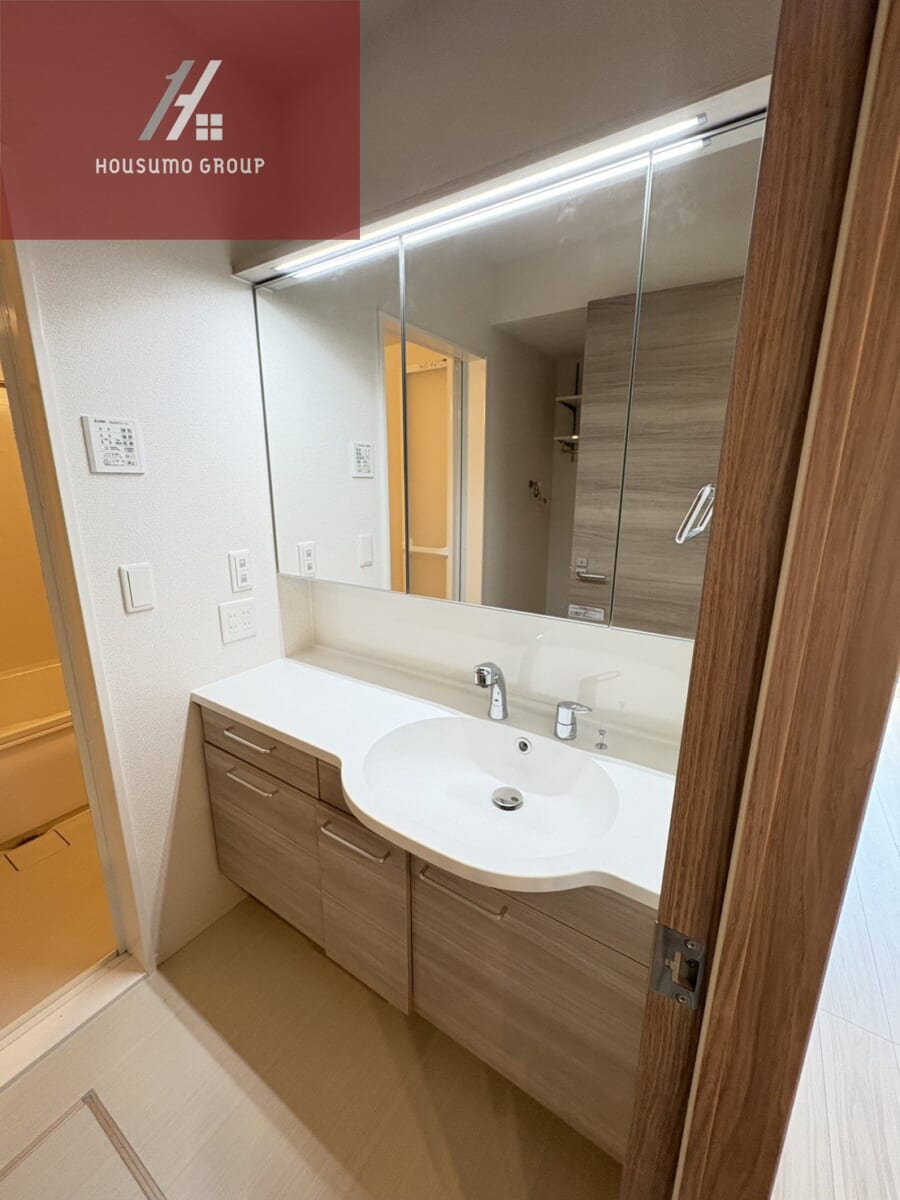 大きな三面鏡付きの洗面台を備えた、使い勝手の良い脱衣所です。広めのカウンターとボウルで、朝の身支度や洗顔もゆったり行えます。木目調の収納キャビネットで、タオルや洗剤、日用品をすっきり整理できます。照明付きミラーで手元が明るかく、清潔感のある空間を演出しています。バスルームと近接しており、入浴後の着替えや家事動線もスムーズな脱衣スペースです。