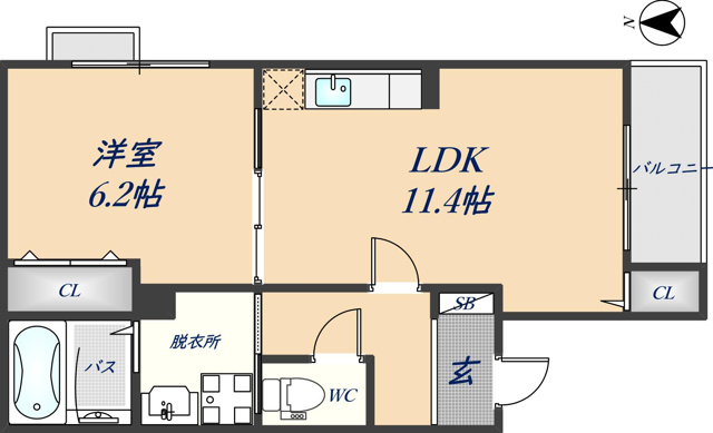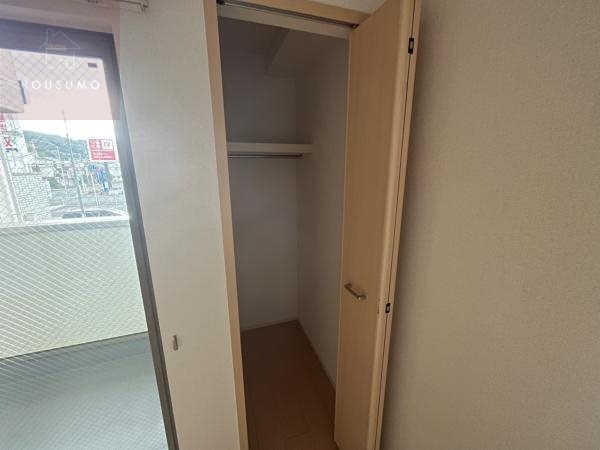 収納はクローゼット付きで、衣類やバッグ、日用品などをすっきり整理できる実用的なスペースです。ハンガーパイプを活用して洋服を掛けて収納でき、シワを防ぎながら管理しやすい設計となっています。棚部分には小物や季節物も収納でき、空間を無駄なく活用できます。居室を広く使えるため、生活感を抑えた快適な住空間を保ちやすい点も魅力です。