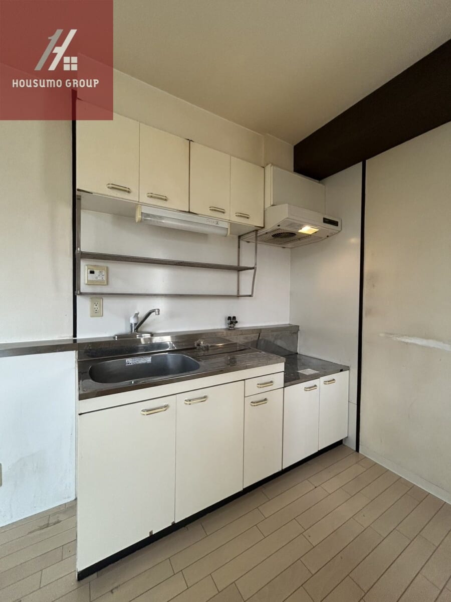 キッチンは壁面に設置されたI型タイプで、調理スペースを広く使えるだけでなく、吊戸棚や足元収納など片付けに便利な工夫が凝らされています。ガスコンロを自由に設置できるコンロ台があり、お好みの調理器具で毎日のお料理を本格的に楽しむことが可能です。シンクの上には水切り棚や照明も備わっており、洗い物や下ごしらえなどの細かな作業もスムーズに進められます。全体が明るいホワイト調で統一されているため、圧迫感を感じさせない清潔感のあるキッチンスペースです。すぐ横に冷蔵庫置き場があるため、食材の出し入れから調理、片付けまでの動線も非常に効率的で快適です。