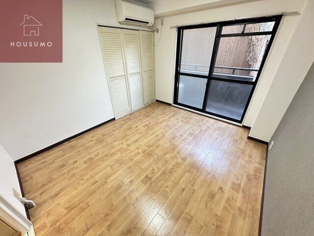 洋室は約5.5帖の広さがあり、温かみのある木目調のフローリングが落ち着いた雰囲気を演出する空間です。お部屋にはエアコンが既設されているため入居当日から快適に過ごせるほか、バルコニーに面した大きな窓からは自然光が差し込み、開放感を与えてくれます。また、クローゼットが完備されており、衣類や生活用品をスッキリと収納できるため、居住スペースを有効に活用できる機能的な設計のお部屋です。