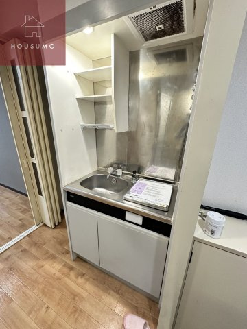 キッチンは、コンパクトながらも効率よく自炊ができる機能的な設計です。火を使わずお手入れが簡単なIHコンロが完備されており、日々の掃除がスムーズに行えるのが魅力です。上部には調味料などを置ける棚、下部には調理器具をしっかり収められる収納スペースが備わっているほか、シンク周りも清潔感のあるメタルパネル仕上げで使い勝手よくまとめられています。