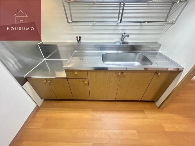 キッチンは木目調のデザインが温かみを感じさせる、広々とした壁付けタイプです。シンクの左右には十分なスペースが確保されており、食材の下準備や洗い終えた食器の乾燥などもスムーズに行えます。コンロ設置スペースが独立しているため、お好みのガスコンロを持ち込んで自分好みの調理環境を整えることが可能です。上部には水切り棚が設置されており、よく使う調理器具や食器を機能的に収納しながら素早く手に取ることができます。下部の収納も充実しているため、大型の鍋やストック品などもすっきりと整理できる、毎日の料理が楽しくなる機能的な空間です。