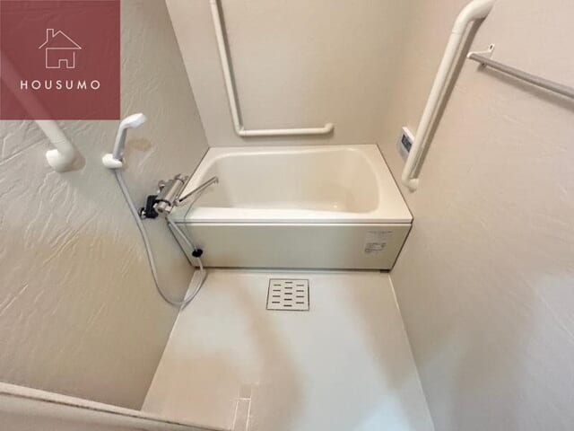 バスルームは、清潔感のあるオフホワイトで統一された、リラックスできる空間です。浴槽の横には手すりが設置されており、お子様からご年配の方まで安全に入浴できるよう配慮されています。洗い場もしっかりとスペースが確保されているほか、壁面には温度調節がしやすい給湯パネルも完備されています。無駄のないシンプルな設計ながら、毎日の疲れをゆっくりと癒やすことができる快適な環境が整っています。ファミリーでの利用にも適した、機能的で使い勝手の良いバスルームです。