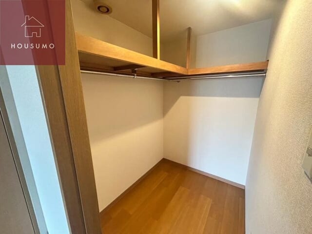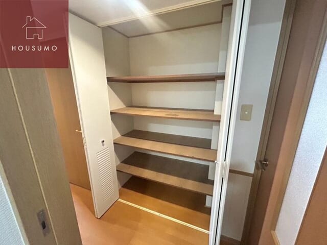 お部屋の各所に多彩な収納スペースが完備されており、荷物の多いファミリーでも住空間をすっきりと保つことができます。洋室には、衣類をハンガーに掛けたまま大量に収納できる大型のクローゼットや、季節物や大きな荷物の保管に便利なウォークインクローゼットが備わっています。廊下部分にも可動棚式の収納スペースが用意されており、掃除用具や日用品のストックなどを整理して効率よく出し入れすることが可能です。すべての収納が白を基調とした扉で隠せるようになっているため、来客時でも生活感を感じさせない洗練された空間を維持できます。
