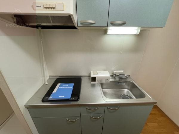キッチンは、お手入れが簡単なIHクッキングヒーターを採用したシステムキッチンです。2口コンロが備わっているため、メイン料理と汁物を同時に作るなど効率よく調理を進められます。シンク上部には照明付きの吊戸棚があり、調理器具や食器類をすっきりと整理できる収納スペースが確保されています。また、コンロの上には換気扇が設置されており、室内の空気をクリーンに保ちながらお料理を楽しめます。淡いブルーのパネルがアクセントになった清潔感のあるデザインで、毎日の自炊が快適になる機能的な設計です。