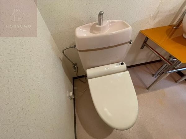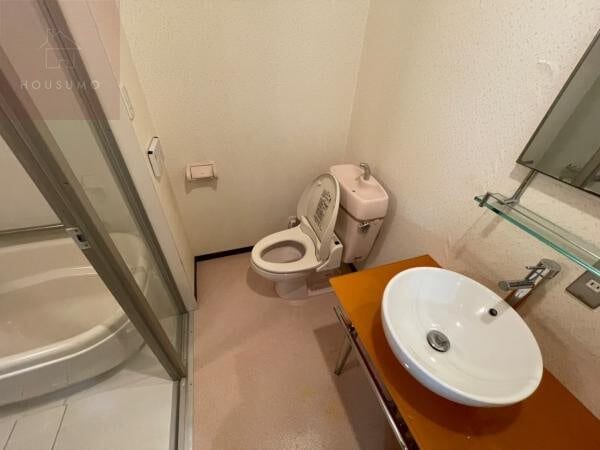 トイレは、脱衣所や洗面スペースと同じ空間に配置された、アメリカンセパレートタイプのような開放感のあるレイアウトです。毎日快適に使用できる温水洗浄便座が完備されているほか、手洗い付きのタンクが採用されており、機能性にも優れています。白を基調とした清潔感のある内装に、温かみのあるオレンジ色の洗面カウンターがアクセントとなり、スタイリッシュで明るい雰囲気を演出しています。壁面にはペーパーホルダーも備わっており、限られたスペースを有効に活用した使い勝手の良い設計が魅力です。