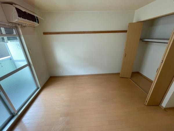 洋室は明るい色調のフローリングが心地よい空間で、バルコニーに面した大きな窓からは自然光がたっぷりと差し込みます。壁面には便利なハンガーレールが設置されており、お気に入りの洋服や小物をディスプレイするように掛けておくことができます。室内にはエアコンが1基設置されているため、入居したその日から快適な温度でお過ごしいただけるのが嬉しいポイントです。また、お部屋の入り口付近には扉付きのクローゼットが備わっており、生活感を隠して室内をすっきりと保つことが可能です。シンプルで家具の配置がしやすい間取りとなっており、自分好みの居心地の良いお部屋作りを楽しめます。