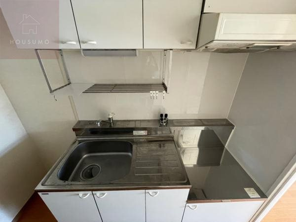 キッチンは、白を基調とした清潔感のあるコンパクトなデザインにまとめられています。一口ガスコンロが設置可能なスペースに加え、シンク横には調理器具を置けるスペースも確保されており、一人暮らしの自炊には十分な機能性を備えています。上下には出し入れしやすい収納戸棚が完備されているため、食器や調理道具をすっきりと整理して、キッチン周りを常に美しく保つことが可能です。また、手元を明るく照らす照明や換気に配慮されたレンジフードも設置されており、毎日のお料理を快適に楽しめる空間に仕上がっています。