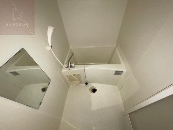 バスルームは、清潔感のある白を基調とした壁面と床面で構成された、コンパクトながらも使い勝手の良い空間です。深さのある浴槽が設置されており、肩までしっかりと浸かって一日の疲れを癒すことができます。壁面には縦長の鏡が備わっているほか、使いやすい位置に配置されたシャワーや操作パネルなど、機能面も充実しています。バス・トイレ別のセパレートタイプとなっているため、湿気を気にせず衛生的に利用できる、単身者にとって嬉しい快適な設計が魅力です。