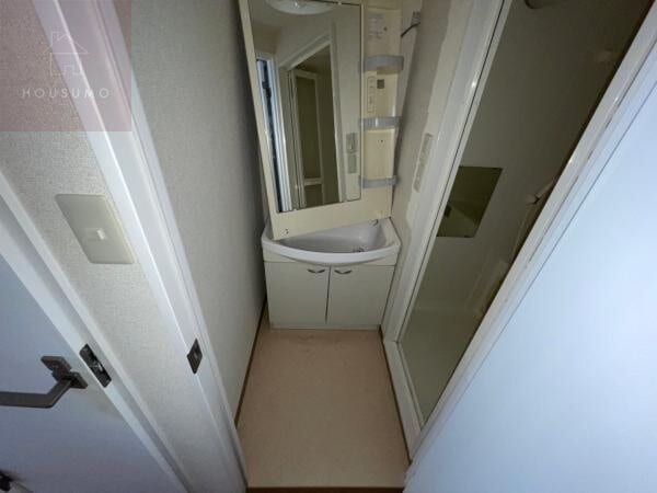 脱衣所は、毎日の身支度をスムーズに整えられる独立洗面台が設置された機能的な空間です。洗面台には、鏡の横に整髪料や化粧品などの小物を整理できる便利な棚が備わっており、手元を明るく照らす照明も完備されています。洗面室のスペースには、室内洗濯機置き場も確保されているため、脱いだ衣類をそのまま洗濯機へ入れられる効率的な家事動線が魅力です。白を基調とした清潔感のある内装でまとめられており、コンパクトながらも生活の利便性を高める工夫が随所に感じられるエリアとなっています。