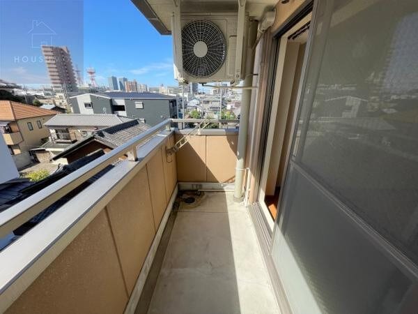 バルコニーは、洋室から出入り可能な南向きの明るい空間で、心地よい日光が差し込む設計となっています。物干し金具が設置されているため、洗濯物を効率よく干すことができるほか、エアコンの室外機も配置されています。周辺には視界を遮る高い建物が少なく、開放感のある眺望を楽しみながらリフレッシュすることが可能です。足元は手入れのしやすいコンクリート仕様で、一人暮らしの気分転換や洗濯といった日常の作業を快適にサポートしてくれるエリアとなっています。